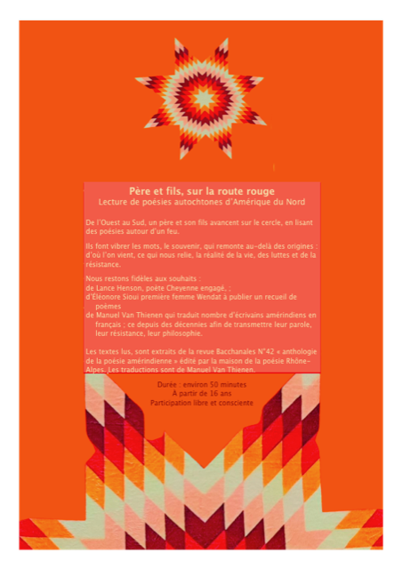 - Pères et fils : lectures de poèmes extrait de Anthologie de la poésie amérindienne contemporains traduits et présentés par manuel van thienen. Lectures et mise en scène avec Zoommanuel de la compagnie Le chardonneret.