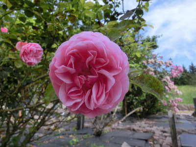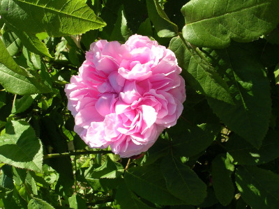 Le rosier de Damas est un arbuste broussailleux, certain disent nain, au Jardin du Couvet ils font plus d’un mètre de haut si on ne taille pas. Il est originaire de Perse, ou ses extractions (entre-autre sur du gras) étaient déjà connues et utilisées. Comme nombre de plante il ne fleurit qu’une fois l’an, durant le mois de mai à juin sur notre jardin. Cela peut être plus tôt dans le sud, ou a plus basse altitude. A 650m en zone de montagne on me l’avait toujours déconseillé, pourtant les 15 rosier sont bien là heureux de prospérer. On s’accorde aujourd’hui sur le fait que c’est un rosier hybride, considéré comme l’un de type important de « roses anciennes » … Il serait un croisement en R. moschata et R. gallica, ou ente cette dernière et R. phoenicia….